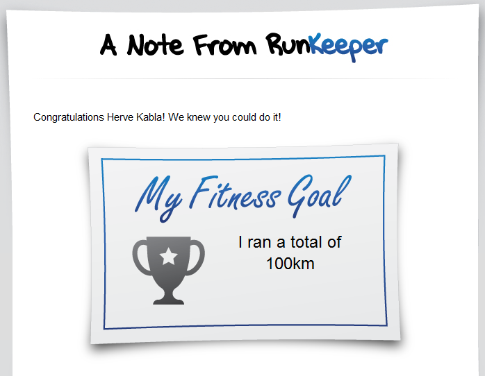 Avec sa nouvelle fonctionnalité appelée « Goal », on peut désormais se fixer des objectifs sur RunKeeper. Des objectifs simples, comme totaliser une certaine distance sur une période considérée, ou réussir à courir une course d’un certain type. J’ai choisi un objectif pas trop compliqué pour commencer, 100 km sur un mois.