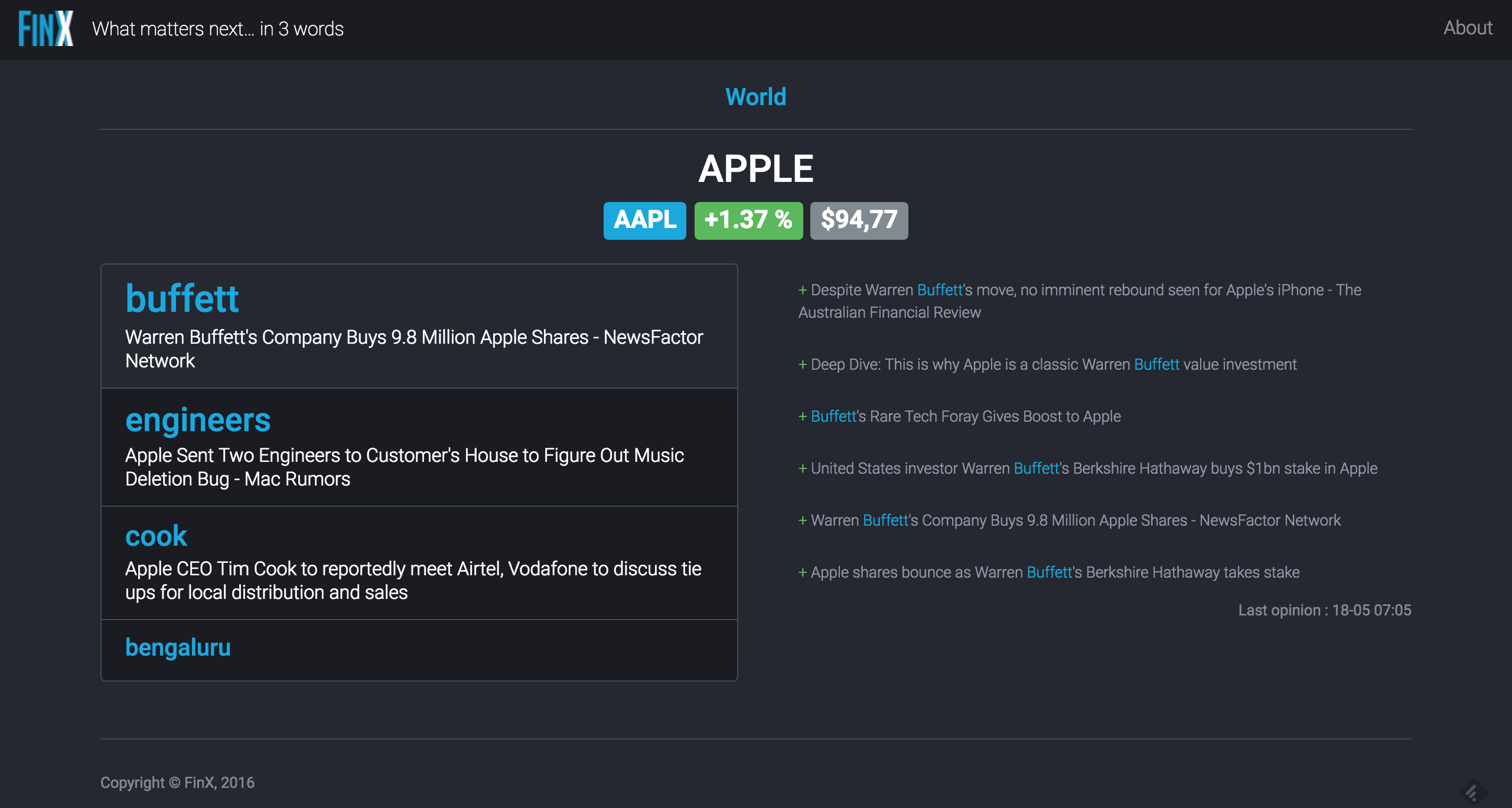 FinX se compose d’un tableau de bord pour l’instant fixe, mais qui sera rapidement personnalisable, qui permet de suivre un certain nombre de sujets d’actualité. Il peut s’agir de noms de pays qui font l’actualité (Chine, Japon, EU), de technologies qu’on souhaite suivre (bitcoin, robotique, réalité virtuelle), de thématiques professionnelles (matières premières, Brexit) ou d’entreprises identifiées (Apple, Amazon, …) par leur code de valeur boursière. Dans la copie d’écran ci-dessus, par exemple, on peut suivre l’actualité autour de la FED, de la Chine, du Japon, ou de la société Apple. Sous chaque terme, FinX fait ressortir 6 sujets que son moteur d’analyse a identifié comme étant fortement corrélés à l’actualité du terme considéré. Par exemple, Apple est fortement corrélé, à l’heure où je rédige cet article, aux sujets suivants: Cook, Bengaluru, Announces, Buffet, Berkshire, Engineers (le site fonctionne en anglais pour l’instant).