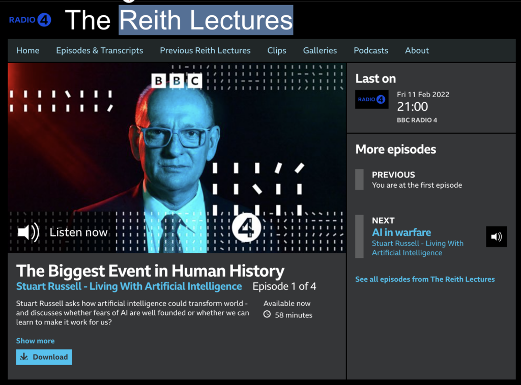 Mais je suis vite passé à la série de conférences qui m’intéressait le plus, celle de l’édition de 2021, avec un spécialiste de l’Intelligence artificielle, le professeur Stuart Russell, qui enseigne à Berkeley. Son cycle de conférences portait sur la cohabitation entre l’espèce humaine et les machines savantes, dans un futur très proche, et le titre de ses interventions était extrêmement explicite :