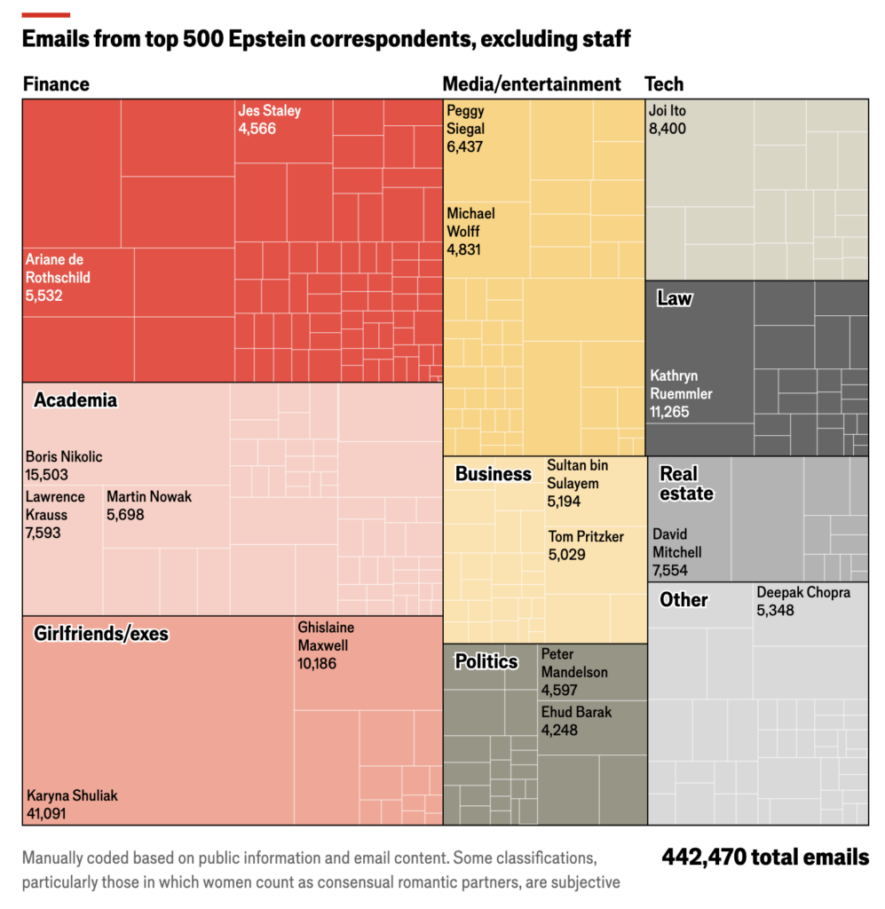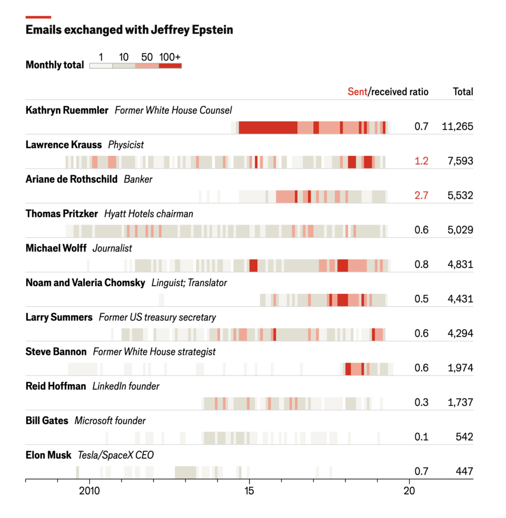 DIsons-le tout de suite, c’est assez effarant. Ce type disposait d’un réseau de connexion presque dans tous les secteurs et dans tous les pays. Amusez-vous à taper un nom ou un terme au hasard pour voir ce que cela renvoie, c’est tout bonnement stupéfiant. Bien sûr, cela ne signifie pas que les personnes apparaissant dans les mails incriminées ont bénéficié des services « sexuels » de ce prédateur de haut-vol : il faut une analyse un peu plus poussée qu’une simple recherche en mode texte pour se faire une nature des échanges. Est-ce que le nom est simplement cité ? Est-il destinataire ou correspondant régulier ?