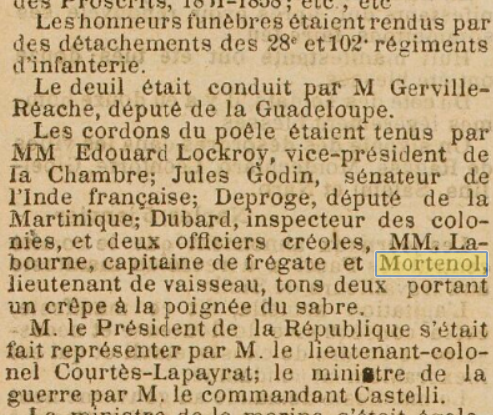 Camille Mortenol, qui n’était pas Camille, mais très probablement André, était un officier de Marine , certes très intelligent (on n’est pas polytechnicien pour rien :), mais un marin moyen. La couleur de sa peau le handicapait dans ce qui constitue une part importante du métier d’officier de Marine au XIXème siècle : la représentation auprès des autorités des colonies et des pays amis ou moins amis. N’ayant pas été admis à l’Ecole de guerre, il pouvait donc estimer qu’atteidre le grade de Capitaine de Vaisseau. était ce qu’on appelle une belle carière.