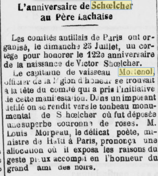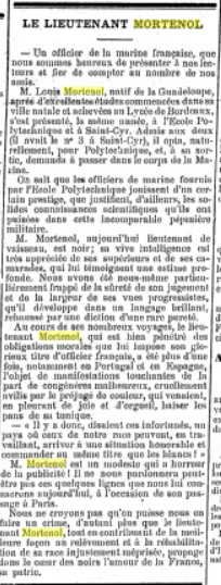 - Son pacha en 1896 : « Monsieur Mortenol est un excellent officier, dont j’ai déjà eu l’occasion d’apprécier les services. La seule chose qui lui soit préjudiciable est sa race, et je crains qu’elle soit incompatible avec les positions élevées de la Marine, que son mérite et son instruction pourraient peut-être lui permettre d’atteindre sans cela ».
