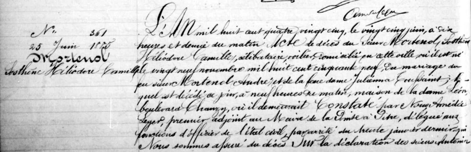 - Camille Mortenol, vous êtes sûr ? Et bien non. Il est très très très probable que ledit Camille ne fût pas Camille, mais son Frère aîné Eugène, André – donc André. Camille (je continuerai à l’appeler ainsi, c’est plus simple) aurait donc intégré l’X à 24 ans ! Détail de l’histoire (j’adore cette expression, passée à la postérité)? Un détail, certes, mais pas anodin. On sait combien la maturité est importante dans la réussite du concours… Et, accessoirement, à 24 ans, il avait dépassé la limite d’âge. La preuve en image : Le vrai Camille Mortenol est décédé en 1885 !!!