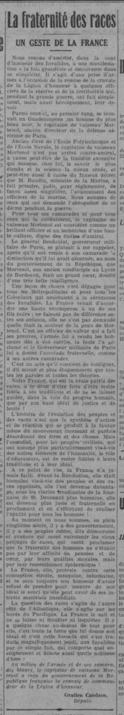 - Enfin, j’ai cette perle – il faut bien que j’apporte quelque chose en sus de résumer Wikipedia. Tout est dans la coupure de presse que je copie-colle. Je me suis dit que c’était 50/50, le sieur Grodet ayant probablement cherché des noises à un officier « nègre » par pur racisme, et ce dernier, ayant dû « jouer au con », refusant de se laisser marcher sur les pieds par un simple gouverneur de colonie, non-X de surcroît :). Je suis donc allé regarder qui était cet Albert Grodet, vous pensez. Je ne suis pas allé chercher loin, je me suis contenté de mon ami de toujours, nettement plus fiable que ChatGPT, Wikipedia. Et je n’ai pas été déçu :