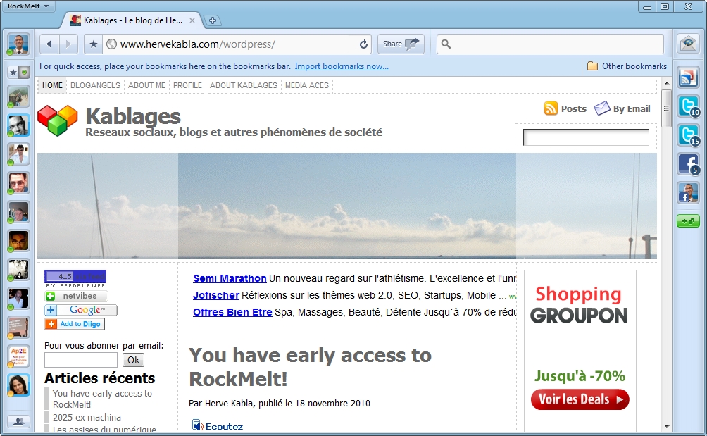 Comme tout outil viral qui se respecte, d’abord, RockMelt n’est pas pour tout le monde: il faut avoir reçu une invitation à l’utiliser. Comme pour GMail ou Google Wave, on s’inscrit et on attend l’invitation, ou bien un ami des plus gentils vous envoie une invitation (chaque nouvel utilisateur a droit à trois invitations, apparemment stock à renouveler à l’issue de la première salve). Yann et Florence font partie de mes amis privilégiés, normal, ils le méritent.