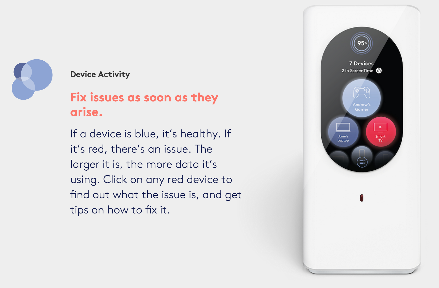 Ca a l’air bien beau, mais d’abord, c’est un peu cher (350$) pour un routeur WiFi. Et puis ensuite, honnêtement, ce n’est pas parce qu’un appareil mal connecté apparaît en rouge clignotant sur une grosse boîte un peu design, que cela va être plus facile de réparer le réseau…